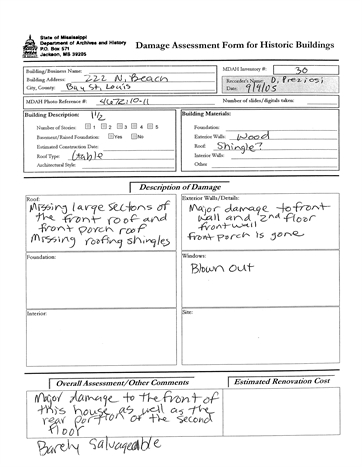 MDAH Damage Assessment Form, 222 N. Beach, Bay St. Louis Hancock Co. MDAH 9-9-2005 from MDAH HRI db Accessed 8-13-2014