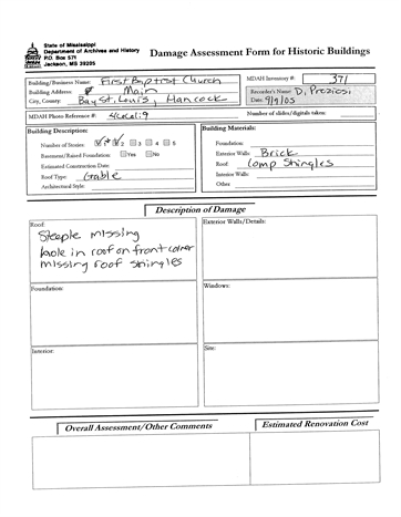 ‘MDAH Damage Assessment Form, First Baptist Church, Bay St. Louis Hancock Co. MDAH 9-9-2005 from MDAH HRI db Accessed 8-13-2014’ Published August 13, 2014 at 362 × 467 in Looking Back Katrina’s 9th Anniversary: Bay St. Louis & Waveland ‹ Back