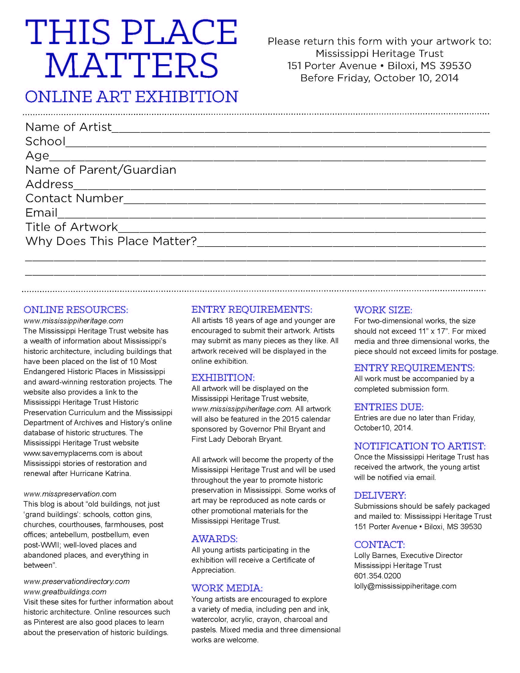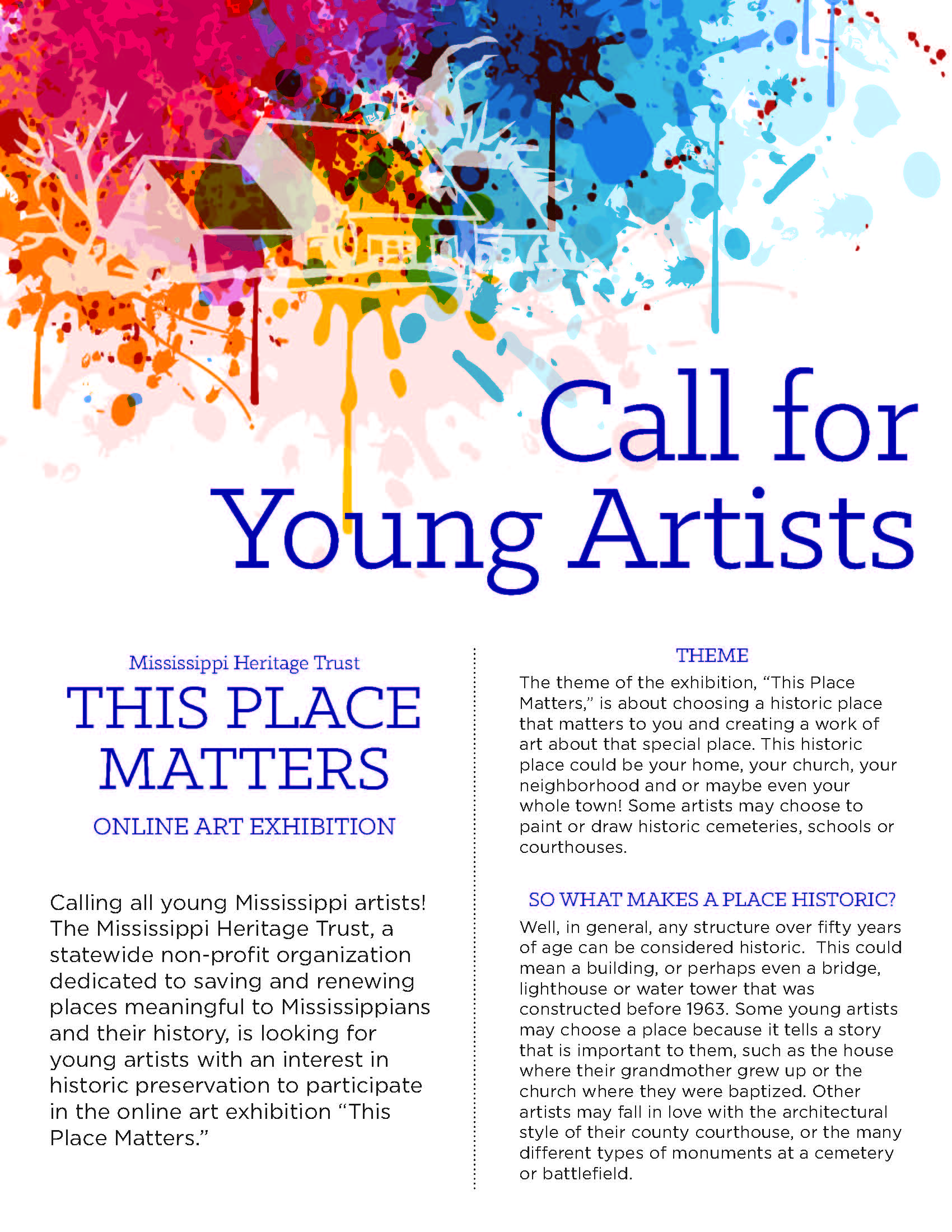 The Mississippi Heritage Trust is calling all young artists to share their drawings, paintings, sculptures and photographs of the historic places that matter the most to them. In addition to being featured on the Mississippi Heritage Trust’s online gallery, a few talented artists will have their work featured in a calendar for 2015, which will be presented by the Governor and First Lady and sponsored by our friends at Sanderson Farms. Deadline for submission is October 10. Pass the purple crayon please!