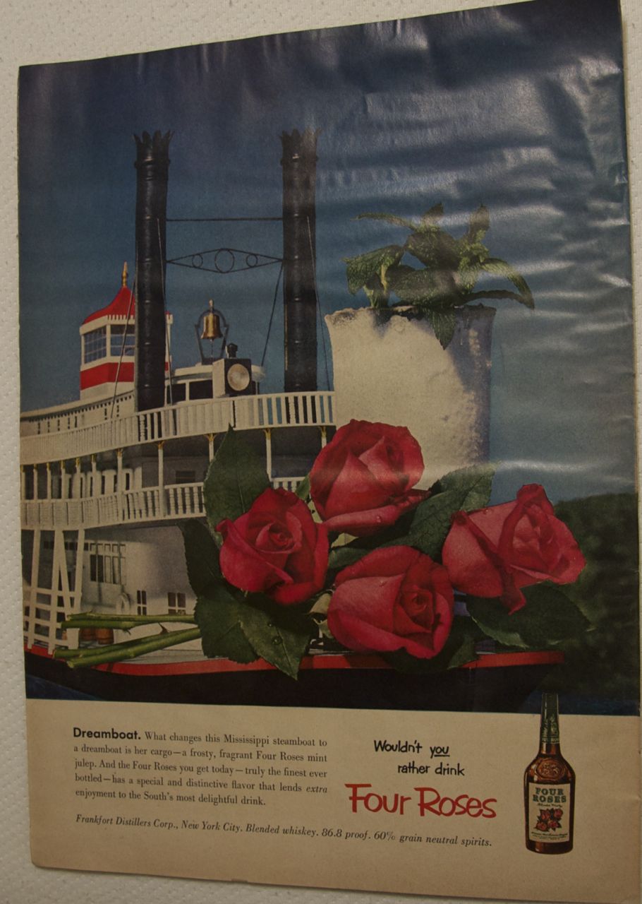 The illustrations in Stuart Purser’s Steamboats on the Mississippi resemble those in the ad, although I could not find any actual steamboats matching the design of the Four Roses ad.  Mark Davis’ article on the murals commissioned during the public arts work projects of the New Deal Administration indicates steamboats were favorites, as were others depicting life on the Mississippi.