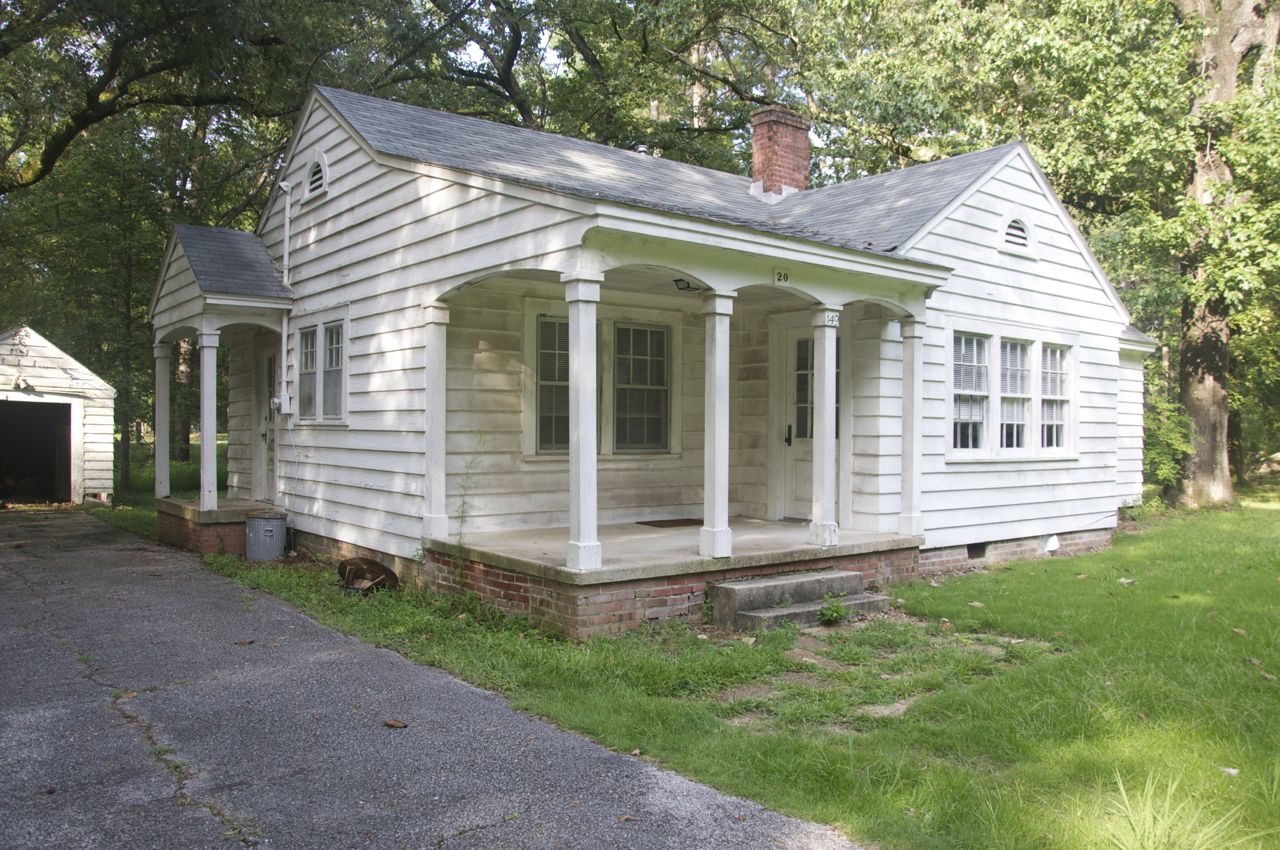 Tupelo Quarters 20: 37’x35’x19′, side-gable frame cottage has a front gable projection and an engaged porch. Front gable projection has a half-moon vent and triple window. Porch has square posts with arched frieze panels. The house has an interior brick chimney and boxed cornice. (Brown, from the NRHP nomination form)