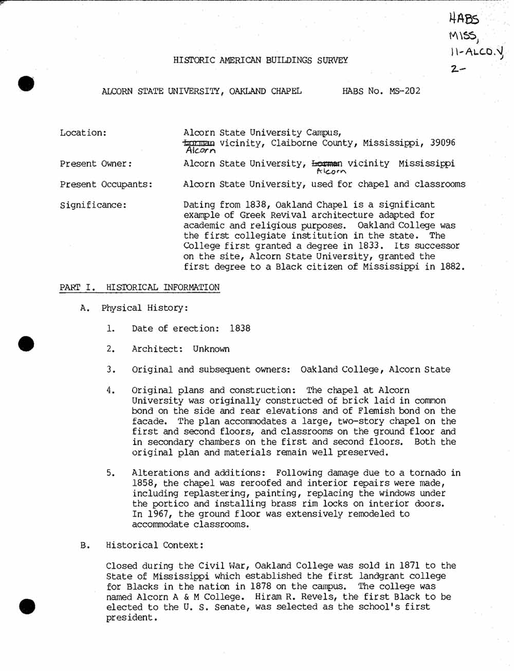 HABS in Mississippi: Oakland Chapel, ASU