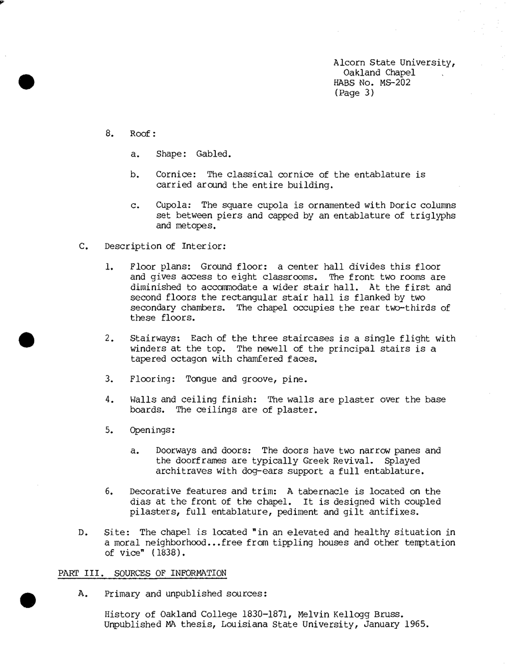 1. There is no information about Oakland Chapel’s construction in the school history Centennial History of Alcorn A. &. M. College by Melerson Guy Dunham, though the book does say that the college buildings were constructed by area slaves whose descendants have likely attended Alcorn. However, one of the footnotes states that an early secondary source for Oakland’s history is Benjamin Chase’s Brief Sketch of the Origin and History of Oakland College, an unpublished 1867 manuscript held by the Natchez Historical Society. It is possible that manuscript has some information about the Chapel that has not been passed down into later texts.