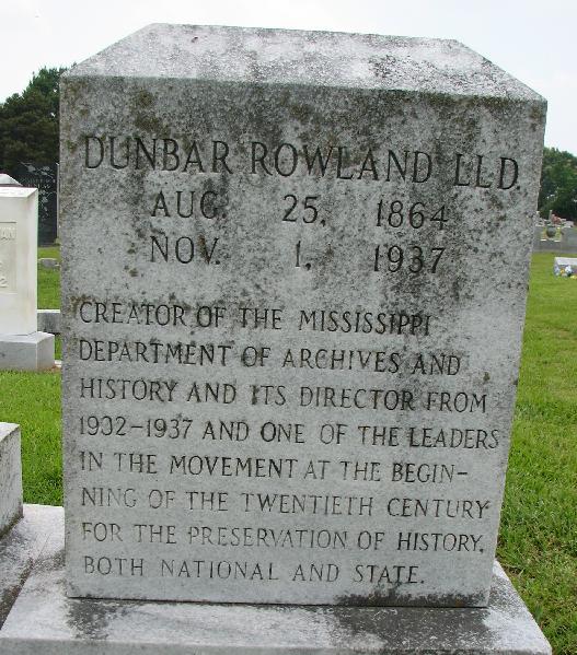 Dunbar Rowland's grave marker in Cedarlawn Cemetery, Jackson. Photo by Natalie Maynor, FindAGrave.com