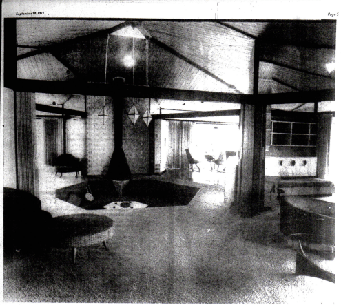As promised in the comment section last August, here is a post with an interior photograph of the Bruce Goff- designed Gutman House. The Gutman House stood at 154 Bayou Circle in Gulfport, backing up onto Gulfport Lake. This article, published by the Biloxi Daily Herald in its Mississippi Scene Magazine, describes how the “Star House” came into being, and provides a color plate that black and white photos cannot do justice.