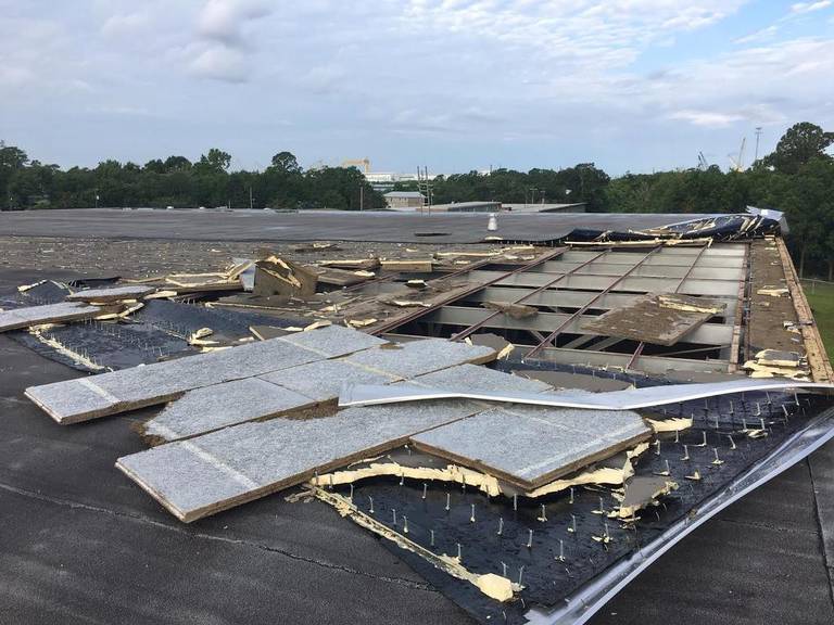 A Friday night tornado sucked the roof off of a large portion of the City Recreation Department_s gym on Pascagoula Street. Pascagoula Recreation Department