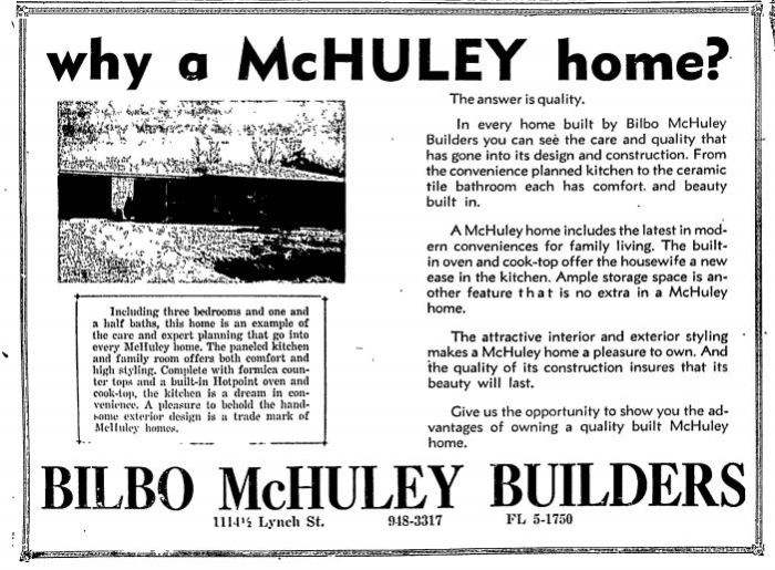 We were recently introduced to builder Bilbo McHuley and architect William Lattimore, the duo that was designing and building homes for Jackson’s African-American community in the late 1950s & early 1960s. I came across this ad for self-described “Jackson’s foremost home builders” in a November 23, 1963 edition of the Mississippi Free Press. It advertises an open house on Corinth Street in West Jackson to be held on Sunday, November 24th of a custom-built home designed by W. A. Lattimore and built by McHuley. Unfortunately the poor quality of the microfilm has made the image of the house all but impossible to discern. It appears to be a hipped roof ranch house. According to the text it has a carport with a utility room