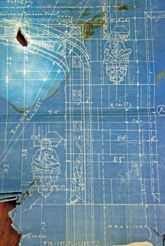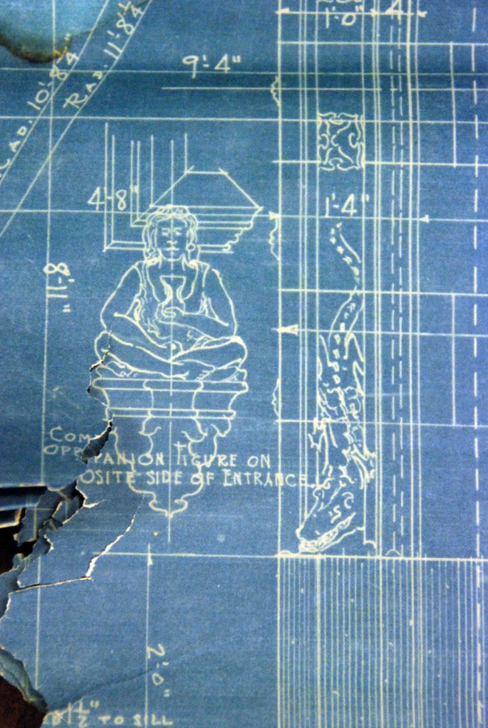 Am I correct that the plan doesn’t show the alligator directly below the sitting figure? The patched holes though are below? The alligator to me looks to be part of trim work/detail to the inside of the sitting figure? Or are the blue prints simply showing detail drawings?