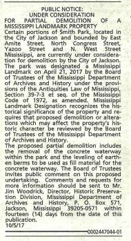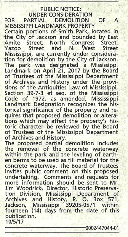 The proposed partial demolition includes the removal of the concrete waterway within the park and the leveling of earthen berms to be used as fill material for the concrete waterway. The [MDAH] Board of Trustees invites public comment on this proposed undertaking. Comments and requests for more information should be sent to Mr. Jim Woodrick, Director, Historic Preservation Division, MDAH, P.O. Box 571, Jackson, Mississippi, 39205-0571 within fourteen (14) days from the date of this publication [i.e., by October 19].