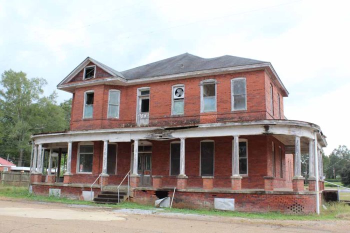Constructed in 1908, the Cochran Hotel, also known as the Pinnix Hotel, replaced an older wooden hotel that was lost to fire. This fine brick building, with its welcoming wrap-around porch, is an excellent example of a turn-of-the-century railroad hotel. Citing structural issues, the owner has applied to have the building de-listed as a Mississippi Landmark in order to demolish it. The Mississippi Department of Archives and History has requested that the owner provide a Structural Condition Analysis before any action is taken. Residents of Ackerman have expressed interest in seeing this local treasure restored to become an inn to compliment the many heritage tourism attractions in the area. The building is currently for sale for $15,000.