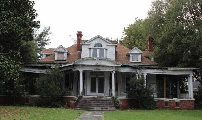 The Stage Marye-Gillette House, built to resemble a showboat, was once one of the most beautiful homes in Greenwood. Constructed in 1910, the Colonial Revival-style house stands out with its ornate wrap-around porch, central gabled dormer with a Palladian window and dentil cornice flanked by two small gabled dormers with Ionic pilasters and bas relief ornament in the gable ends. Today, the house sits empty and deteriorating, with its stunningly detailed porch a shambles. Currently for sale for $65,000, there is community interest in saving the house to become an inn and event space.