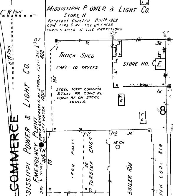 In the N.W. Overstreet Architectural Records at MSU are sheets 2-5 of plans for Mississippi Power & Light Company Warehouse & Car Barn, 1929.