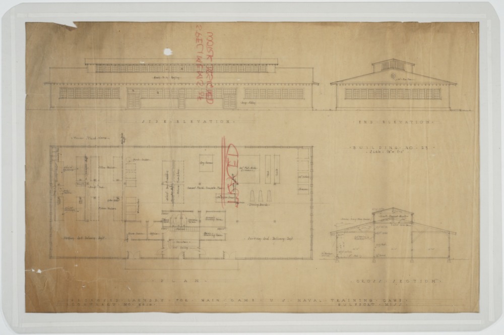 Elevations, floor plans, sections of proposed laundry building for main camp. U.S. Naval Camp, Gulfport, Miss. Martin Evans Boyer Papers, 1910-1993 (UNCC MC00094), J. Murrey Atkins Library Special Collections at the University of North Carolina at Charlotte
