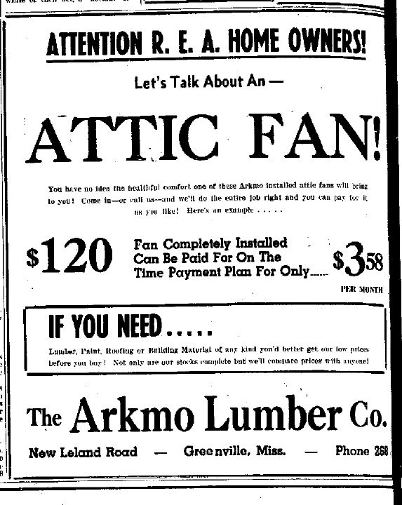 From the August 10, 1939 edition of the Greenville Delta Democrat Times. The Arkmo Lumber Co, was selling attic fans on installment plans to home owners who were just receiving electricity as part of the Rural Electrification Act or R.E.A.