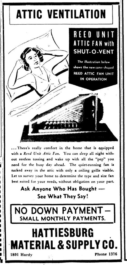 From the June 11, 1941 edition of the Hattiesburg American. The Hattiesburg Material & Supply Company was selling Reed brand attic fans.