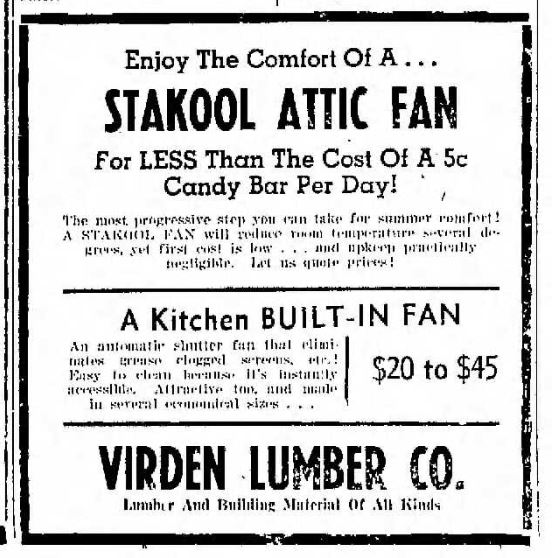 From the June 29, 1939 edition of the Greenville Delta Democrat Times. The Virden Lumber Co. was selling Stakool brand attic fans.