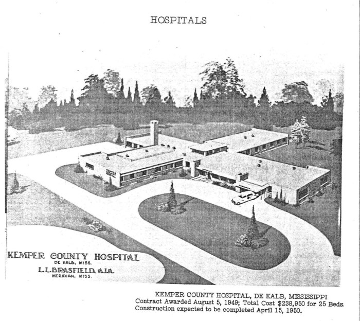 This week’s Hill-Burton hospital, located over in the tiny county seat of DeKalb, had this eye-catching rendering in New Hospitals and Health Departments for Mississippi, which was published by the Mississippi Commission on Hospital Care around 1950. As you may remember, the Hill-Burton Act set up a funding mechanism for states to build public hospitals and health clinics, and by the end of the first five years of the program, Mississippi was a leader in getting these built.
