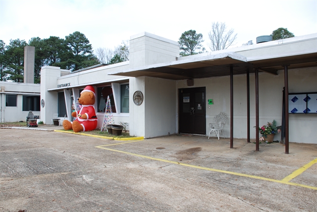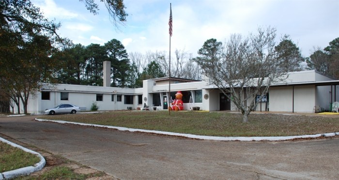 I went in search of the Kemper County Hospital online, since I haven’t been to DeKalb in a while, and I found a brief record in the MDAH Historic Resources Database that didn’t have much text but did give us a map location and some fairly recent pictures (complete with a Christmassy bear theme since they were taken in December). The pictures show the building has had a few changes (or maybe a few items shown in the rendering didn’t get built exactly that way), but overall, this is still a cool modernist building. The raised clerestory or lightwell represented in that higher section of roof near the entrance appears to be covered up, which I suspect came about because it leaked, but it’s still there if someone wanted to let a little light back in.