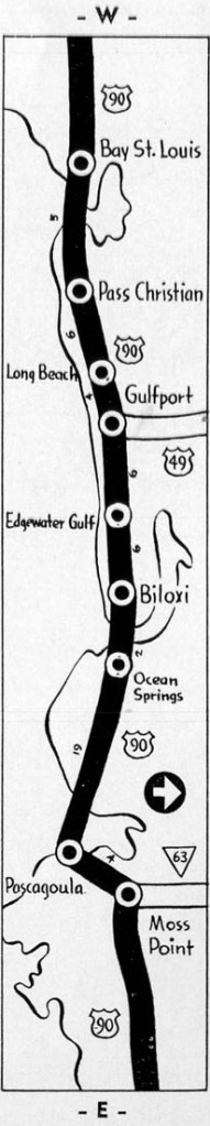 Scarcely ever losing sight of the blue waters of the Mississippi Gulf, winding through arches of Spanish moss, bordered on one side by cool, green grass, and on the other by expanses of sparkling sand, “The Old Spanish Trail” leads the Mississippi traveler straight to the historical sights and recreational opportunities of the famous “Seven-Cities-by-the-Sea.”