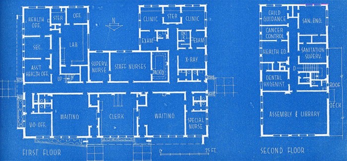 Here is a slightly larger health center, also for a generally rural locality. It has all of the customary favilities of the preceding example, though here somewhat larger departments are contemplated, plys a few additional activites. The typical routines and clinics have the first floor; the additional activities, not producing so much traffic, are housed in a partial second story. Child guidance here is a separate department, as is also health education, with the addition of an office for cancer control, also a large laboratory.