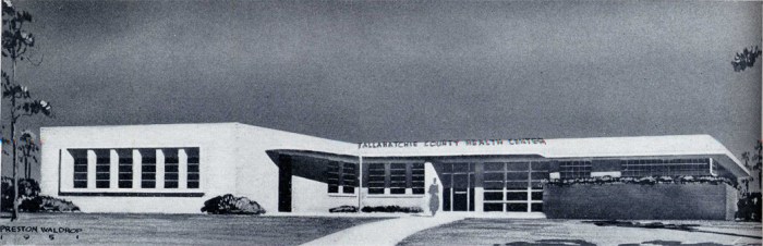 The MDAH Historic Resources Database doesn’t contain a record of this building; neither does it have a record on Preston Waldrop, whose signature is on the rendering above. Looking on Google maps for the Tallahatchie County Health Center, I find this building on a corner one block off of the courthouse square–a site that would make sense for a county health center in the 1950s, but it looks fairly new and not nearly as stylish as Malvaney’s building above. Was Malvaney’s building on this site and replaced by this one? Or was it somewhere else that isn’t jumping out at me on the aerials and maybe it’s still standing? Or . . . since this is just a rendering, not a photo, could it be that this building was never built?