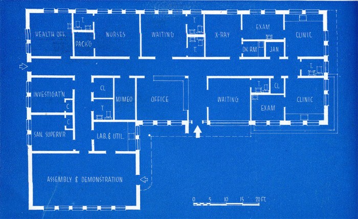 Another health center in Mississippi’s program for extending its health improvement work in rural communities, this one makes a special point of separating traffic, not just by races, but also by activities. The office activities are grouped at one one end, with a separate entrance. And the assembly or demonstration room has an isolated location with front entrance so that lecture groups need not get tangled up in maternity or V.D. visitors. While clinic hours are usually set so as to keep traffic groups divided, it is not possible to stagger hours completely. A nice feature of this plan is the unit of X-ray, examination room and clinic room with connecting doors, a device which also helps to avoid confusion in the corridors in busy hours.