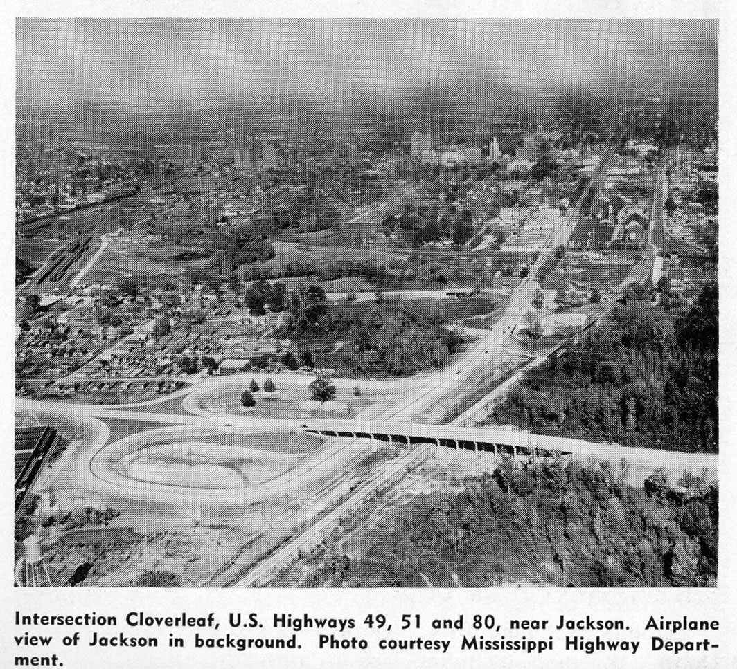 South of Jackson U.S. 49 passes through the Piney Woods, a long series of rolling red clay hills covered with a growth of new longleaf pines [2018 note: MDOT has in recent years destroyed almost all of the beautiful pine-forest medians on Highway 49.]