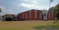 The Daisy McLaurin Stevens Elementary School, opened in 1959 and designed by Jackson architect Jones & Haas, was built as part of the Equalization programs of the late 1950s adjacent to the Brandon High School. The one-story U-shaped brick-veneered building retains many of the features that define the best Modern schools of the post-war era, including long window walls shaded by deep eaves, a covered walk with exposed trusses, and a multi-purpose auditorium/ cafeteria. The building, facing east on College Street in downtown Brandon, is composed of three wings, the one on the north containing the multi-purpose auditorium/cafeteria and two other wings containing classrooms. The main entrance is asymmetrically located near the northern wing and is composed of two sets of double-leaf doors flanked by window walls composed of large, fixed rectangular panes of glass.