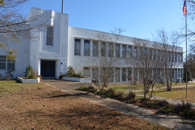 Built in 1941 and designed by Jackson architect N.W. Overstreet, this two-story asymmetrically massed Art Moderne building is one of the the most architecturally significant in Choctaw County. Although contemporary newspaper accounts describe the building as “monolithic concrete,” a 1955 survey of Choctaw County schools describes it as having a steel and concrete structure finished with stucco. The smooth finish creates a planar surface, and curved corners on the library end of the building give a sense of movement valued in the Moderne style. A two-and-a-half-story vertical tower topped by a flagpole marks the main entrance and has a metal grille or brise soleil on the second story. The library is to the left of the entrance behind a mostly blank wall, while to the right, a circular window—Overstreet’s trademark—introduces the long classroom wing, its horizontality emphasized by the two levels of shallow concrete canopies over the windows that wrap to the south elevation. The interior floorplan is intact—a T-shaped hallway plan with double-loaded classrooms on the long wing—has had finishes altered and ceilings dropped for ductwork, but boarded transoms remain.
