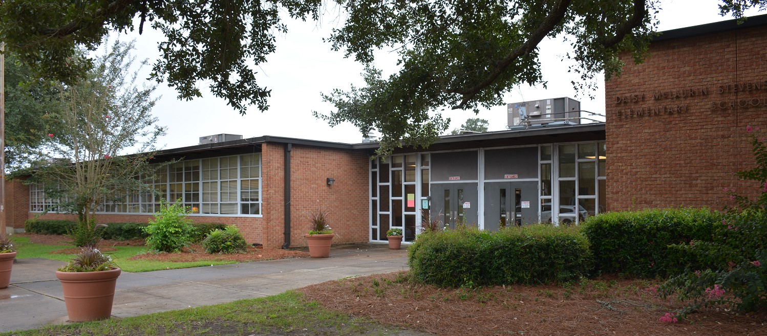 The Daisy McLaurin Stevens Elementary School, opened in 1959 and designed by Jackson architect Jones & Haas, was built as part of the Equalization programs of the late 1950s adjacent to the Brandon High School. The one-story U-shaped brick-veneered building retains many of the features that define the best Modern schools of the post-war era, including long window walls shaded by deep eaves, a covered walk with exposed trusses, and a multi-purpose auditorium/ cafeteria. The building, facing east on College Street in downtown Brandon, is composed of three wings, the one on the north containing the multi-purpose auditorium/cafeteria and two other wings containing classrooms. The main entrance is asymmetrically located near the northern wing and is composed of two sets of double-leaf doors flanked by window walls composed of large, fixed rectangular panes of glass.