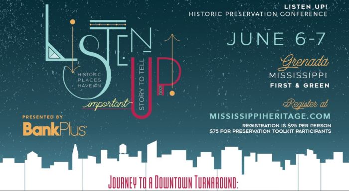 On June 6-7, 2019, the Mississippi Heritage Trust will host the Listen Up! Historic Preservation Conference in Grenada, presented by BankPlus. Using the amazing downtown renaissance that is happening in this historic city, the conference will focus on six essential elements in the journey to a “downtown turnaround.” Speakers will address the question “what does it take to breathe new life into old places?” through case studies of communities around the state including Tupelo, Bay Saint Louis and Greenwood. A panel of community leaders from Grenada will discuss recent successes and future goals.
